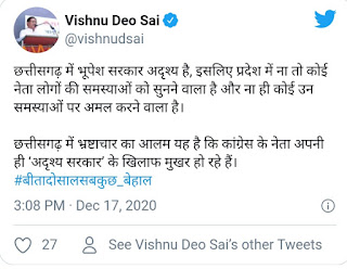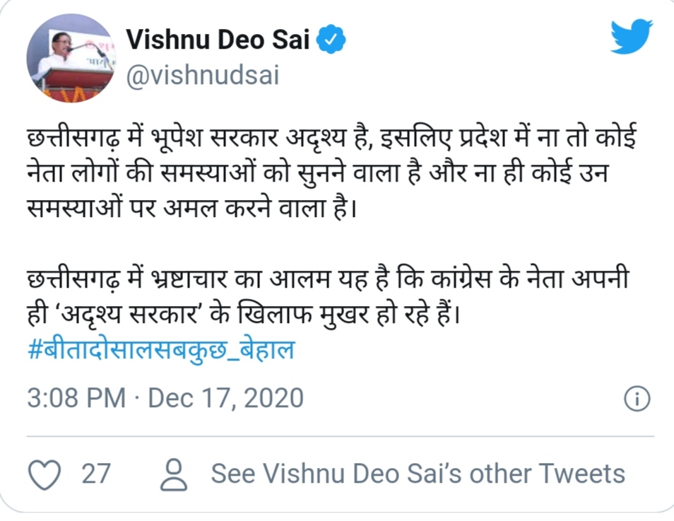 एक और ट्वीट कर साय ने सरकार को घेरा है। उन्होंने लिखा “छत्तीसगढ़ में भूपेश सरकार अदृश्य है, इसलिए प्रदेश में ना तो कोई नेता लोगों की समस्याओं को सुनने वाला है और ना ही कोई उन समस्याओं पर अमल करने वाला है। छत्तीसगढ़ में भ्रष्टाचार का आलम यह है कि कांग्रेस के नेता अपनी ही ‘अदृश्य सरकार’ के खिलाफ मुखर हो रहे हैं।”