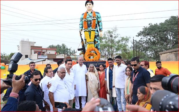 मुख्यमंत्री श्री भूपेश बघेल ने दुर्ग वैशाली नगर विधानसभा के छावनी के तिरंगा चौक में शहीद चुम्मन यादव के मूर्ति का अनावरण किया