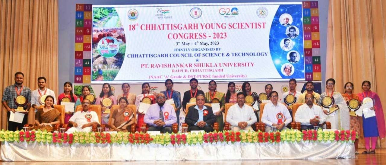 रायपुर . छत्तीसगढ विज्ञान एवं प्रौद्योगिकी परिषद तथा पं. रविशंकर शुक्ल विश्वविद्यालय के संयुक्त तत्वावधान में पंडित दीनदयाल उपाध्याय प्रेक्षागृह में दो दिवसीय 18 वें युवा वैज्ञानिक सम्मेलन का 04 मई को समापन हुआ। इस समारोह में 19 चिन्हित विषयों में युवा वैज्ञानिकों को यंग साइंटिस्ट अवॉर्ड- 2023 प्रदान किया गया। इसके साथ ही इन युवा वैज्ञानिकों को 21 हजार रूपए पुरस्कार राशि, मेडल तथा प्रमाण पत्र देकर सम्मानित किया गया। साइंटिस्ट अवॉर्ड से सम्मानित युवा वैज्ञानिक को किसी राष्ट्रीय प्रयोगशाला, राष्ट्रीय अनुसंधान केंद्र और विश्वविद्यालय में शोध कार्य के लिए अवसर प्रदान किया जाएगा। समापन समारोह के मुख्य अतिथि राष्ट्रीय शैक्षणिक समिति, एनसीएससी, विज्ञान एवं प्रौद्योगिकी विभाग, भारत सरकार डॉ. ललित शर्मा एवं कार्यक्रम की अध्यक्षता कर रहे पं. रविशंकर शुक्ल विश्वविद्यालय के कुलपति डॉ. सच्चिदानंद शुक्ल सहित छŸाीसगढ़ विज्ञान एवं प्रौद्योगिकी परिषद के महानिदेशक डॉ. एस कर्माकर सहित वहां मौजूद समस्त वैज्ञानिकों एवं अधिकारियों ने इन युवा वैज्ञानिकों को बधाई दी और उनके उज्जवल भविष्य की कामना की।