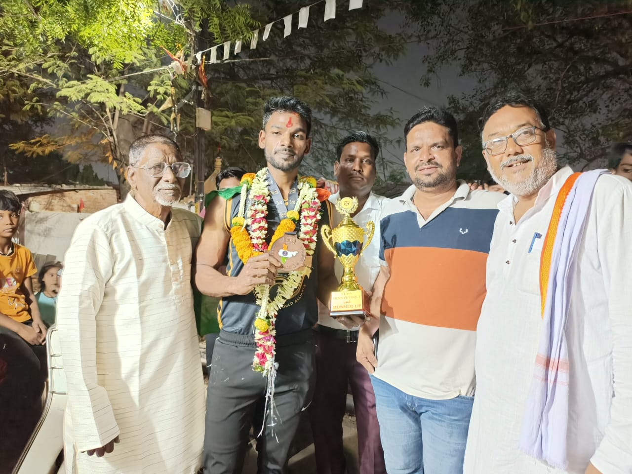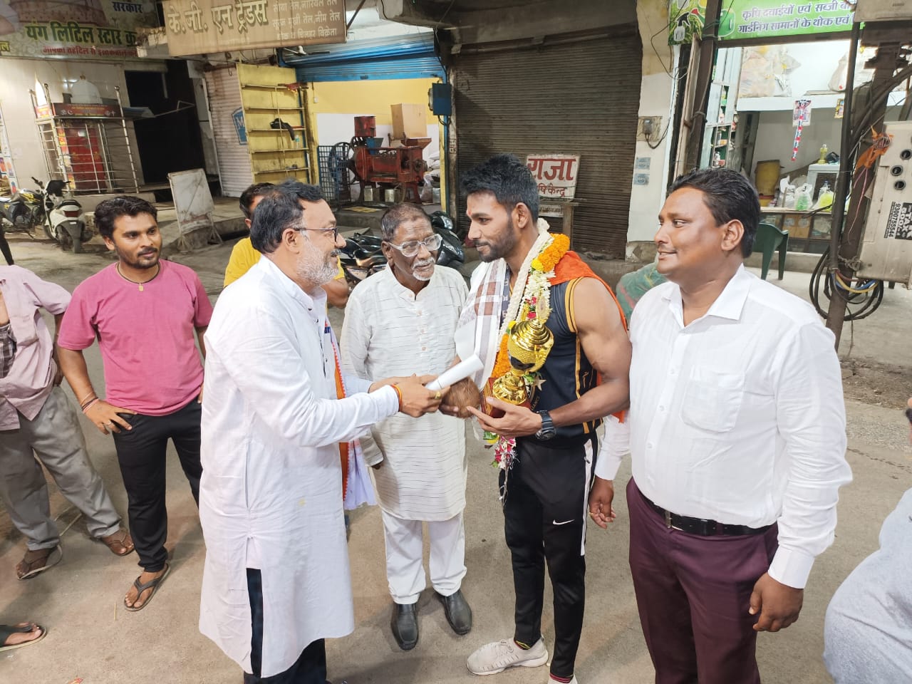 ब्लॉक अध्यक्ष नवीन चंद्राकर और युवा नेता निसार चांगल ने शारीरिक सौष्ठव प्रतियोगिता में विजेता बने विशाल को दी बधाइयां