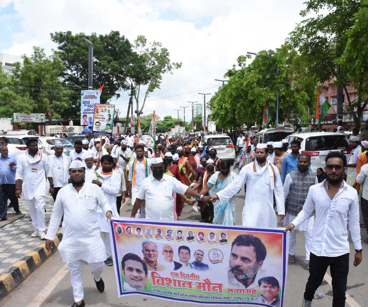 रायपुर (छ.ग.)। कांग्रेस की विचारधारा के साथ सत्य के मार्ग पर चलने वाले राहुल गांधी को लोकसभा से अयोग्य ठहराए जाने के विरूद्ध आज भारत देश अंतर्गत समस्त राज्यों और जिला मुख्यालयों में सभी कांग्रेस कार्यकर्ता एवं नेताओं द्वारा महात्मा गांधी जी की प्रतिमा के समीप एक दिवसीय मौन सत्याग्रह (मौन विरोध) किया गया। वहीं छत्तीसगढ़ की राजधानी रायपुर में अखिल भारतीय कांग्रेस कमेटी के राष्ट्रीय सचिव व संसदीय सचिव विकास उपाध्याय के नेतृत्व में उनके निवास से लगभग 3000 कांग्रेस के नेता एवं कार्यकर्ता मौन सत्याग्रह स्थल गांधी मैदान पहुँचे।