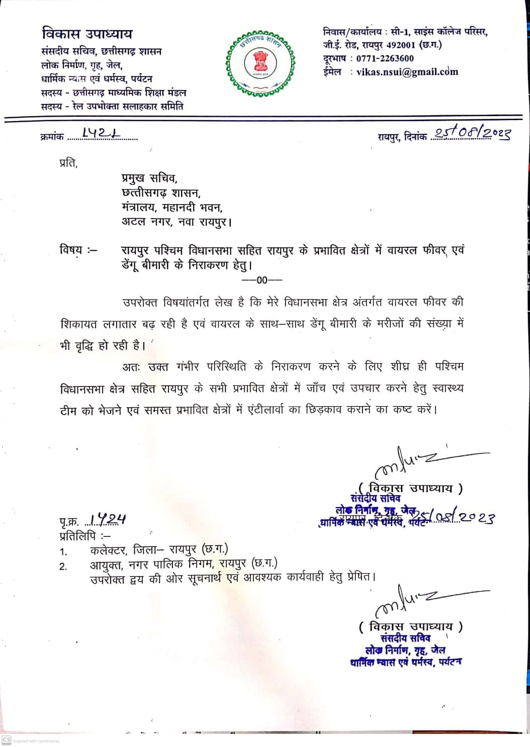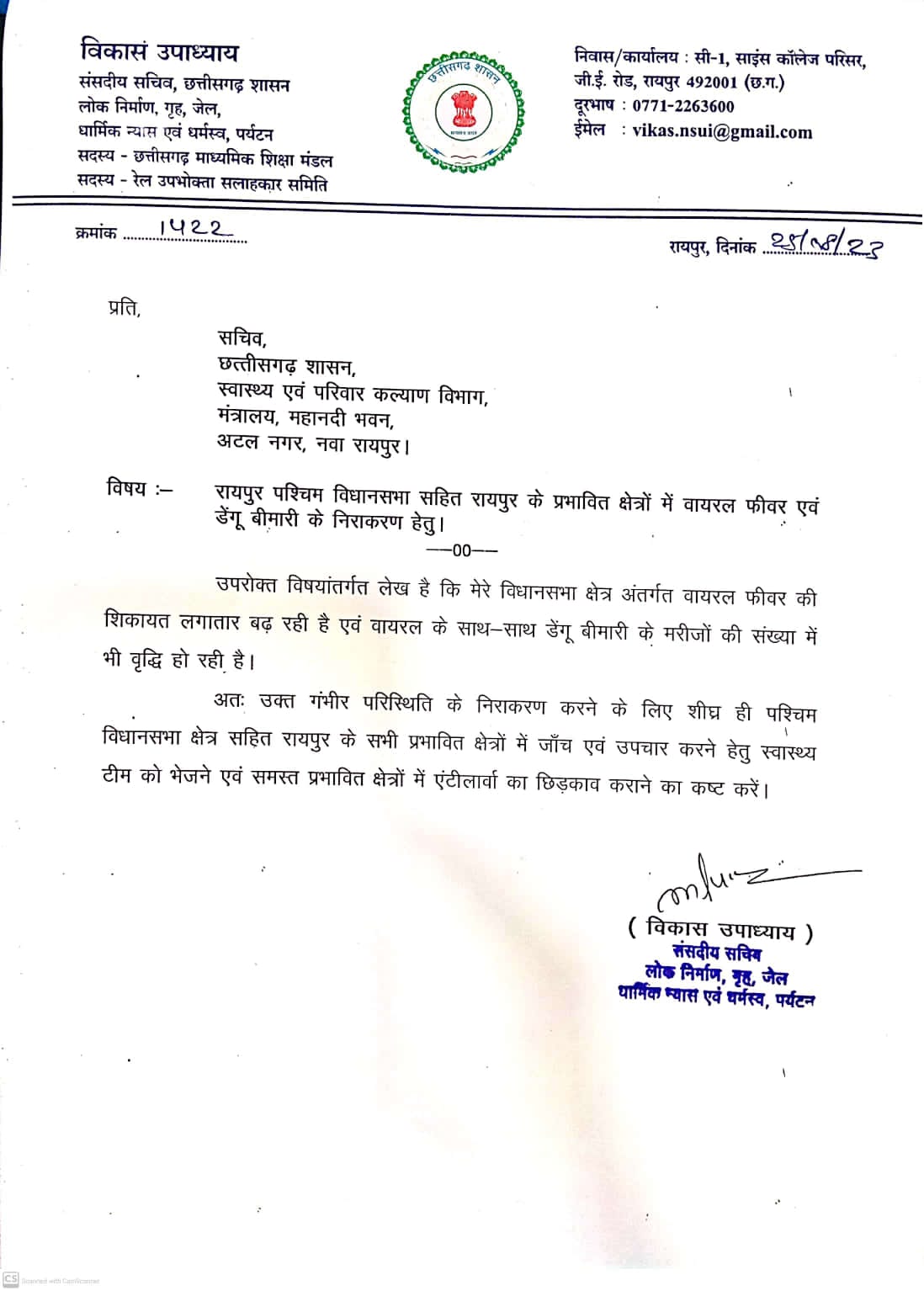रायपुर में बढ़ते वायरल फीवर एवं डेंगू की बीमारी को लेकर विधायक विकास उपाध्याय ने स्वास्थ्य मंत्री, प्रमुख सचिव एवं स्वास्थ्य सचिव को लिखा पत्र