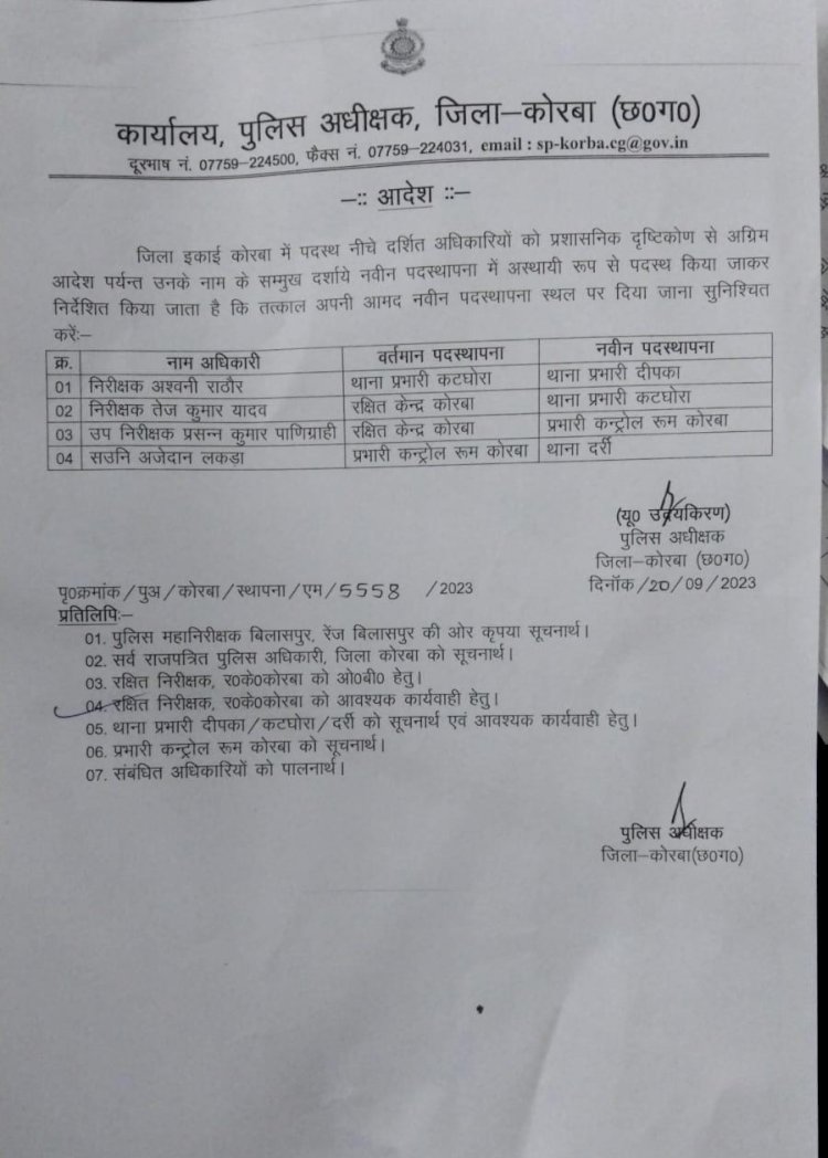 कोरबा: चुनाव के पहले पुलिस में कसावट लाने और क़ानून व्यवस्था मजबूत करने का निर्देश रायपुर पुलिस मुख्यालय की तरफ से जिला पुलिस अधीक्षकों को दिया गया है।कोरबा जिला एसपी के निर्देश पर थाना प्रभारियों की तबादला सूची जारी की गई है।जारी लिस्ट में कटघोरा थाना प्रभारी को अब दीपका का थाना इंचार्ज बनाया गया है। देखें पूरी सूची।