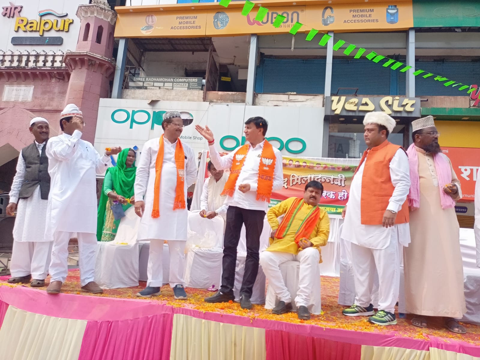 रायपुर /रज्जाक खान।भारतीय जनता पार्टी अल्पसंख्यक मोर्चा जिला रायपुर द्वारा जयस्तंभ चौक पर मंच से पुष्प वर्षा कर के जुलूस का स्वागत किया गया ।
