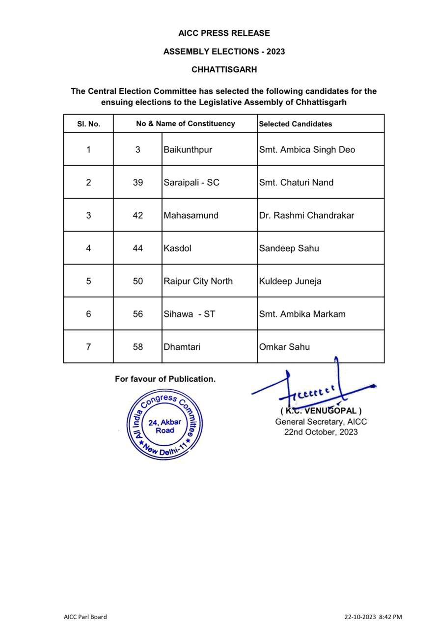छत्तीसगढ़ में कांग्रेस के सात नए उम्मीदवारों सूची जारी, रायपुर उत्तर से कुलदीप जुनेजा, महासमुंद से डॉ. रश्मि चंद्राकर