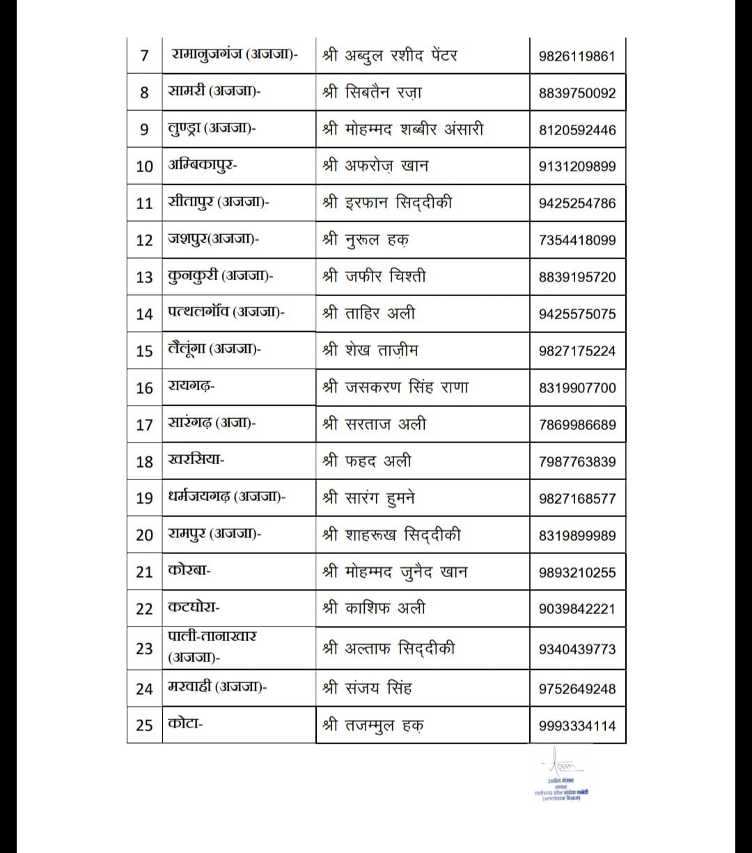 जगदलपुर ।अखिल भारतीय कांग्रेस कमेटी अल्पसंख्यक विभाग के राष्ट्रीय अध्यक्ष एवं राज्यसभा सांसद श्री इमरान प्रतापगढ़ी के आदेश अनुसार एवं छत्तीसगढ़ कांग्रेस कमेटी अल्पसंख्यक विभाग के प्रदेश प्रभारी श्री निजामुद्दीन राइन व सब प्रभारी श्री आसिफ पासा के सहमति से छत्तीसगढ़ विधानसभा चुनाव 2023 हेतु निम्नलिखित पदाधिकारी को विधानसभा का प्रभारी बनाया गया है जिनकी सूची जारी की गई है। जिसमे सभी प्रभारियों को तत्काल प्रभाव से अपने प्रचार क्षेत्र में पहुंचकर अल्पसंख्यक विभाग की बैठक आयोजित कर कांग्रेस प्रत्याशियों के पक्ष में कार्य करने कहा गया है।