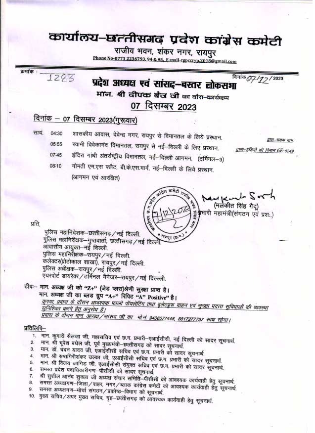 रायपुर।आज कांग्रेस के प्रदेश अध्यक्ष 4:30 बजे शासकीय आवास देवेंद्र नगर से विमानतल के लिए रवाना होंगे जहां से दिल्ली के लिए प्रस्थान करेंगे।