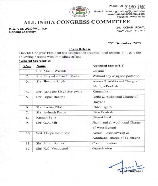 राजस्थान के दिग्गज और वरिष्ठ कांग्रेस नेता सचिन पायलट छत्तीसगढ़ कांग्रेस के नए प्रभारी बनाए गए हैं। वहीं कुमारी शैलजा को इस पद से हटा दिया गया है। विधानसभा चुनाव में कांग्रेस की करारी हार के पार्टी हाईकमान ने ये फैसला लिया है। विधानसभा चुनाव में हार के 20 दिन बाद कांग्रेस अध्यक्ष मल्लिकार्जुन खरगे के आदेश पर पार्टी के जनरल सेक्रेटरी केसी वेणुगोपाल ने इस संबंध में आदेश जारी किए हैं।