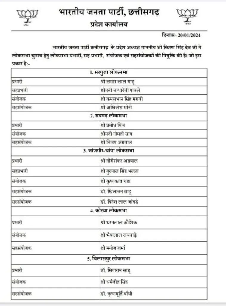 लोकसभा चुनाव के लिए छत्तीसगढ़ बीजेपी ने की लोकसभा प्रभारी, सह प्रभारी, संयोजक एवं सह संयोजकों की नियुक्ति, देखें सूची…