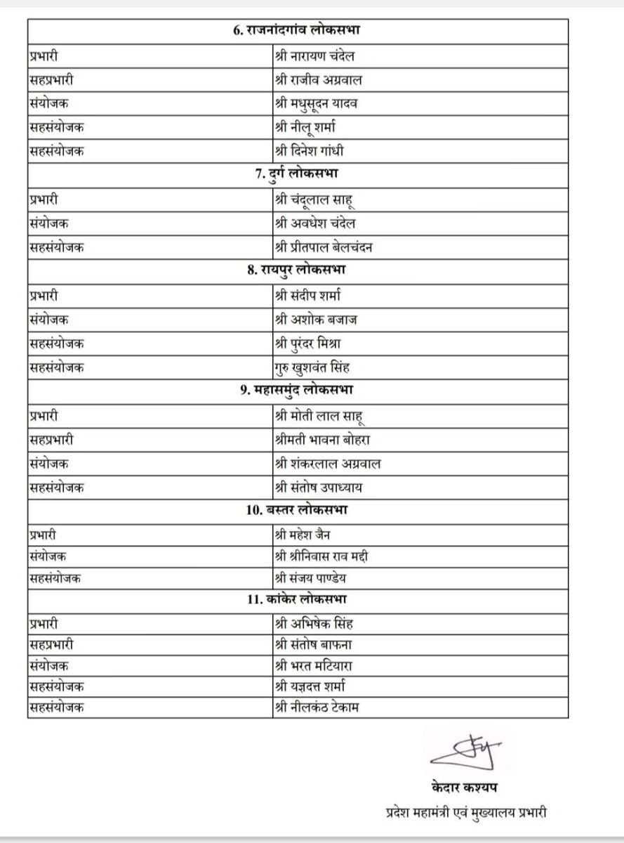 रायपुर। भारतीय जनता पार्टी छत्तीसगढ़ के प्रदेश अध्यक्ष किरण सिंह देव ने लोकसभा चुनाव हेतु लोकसभा प्रभारी, सह प्रभारी, संयोजक एवं सहसंयोजकों की नियुक्ति की है।