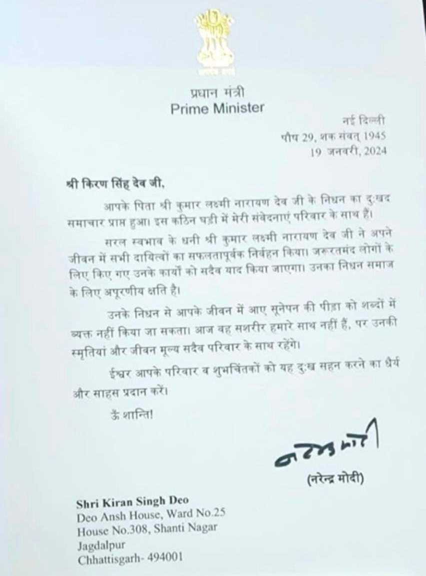 जगदलपुर।देश के प्रधानमंत्री श्री नरेंद्र मोदी भारतीय जनता पार्टी एवं नड्डा ने के राष्ट्रीय अध्यक्ष आदरणीय श्री जगत प्रकाश नड्डा जी एवं देश के गृहमंत्री श्री अमित शाह जी ने छत्तीसगढ़ के प्रदेश अध्यक्ष आदरणीय श्री किरण सिंह देव के पूजनीय पिताजी स्व.श्री लक्ष्मी नारायण सिंह देव जी को अपनी श्रद्धांजलि दी है।