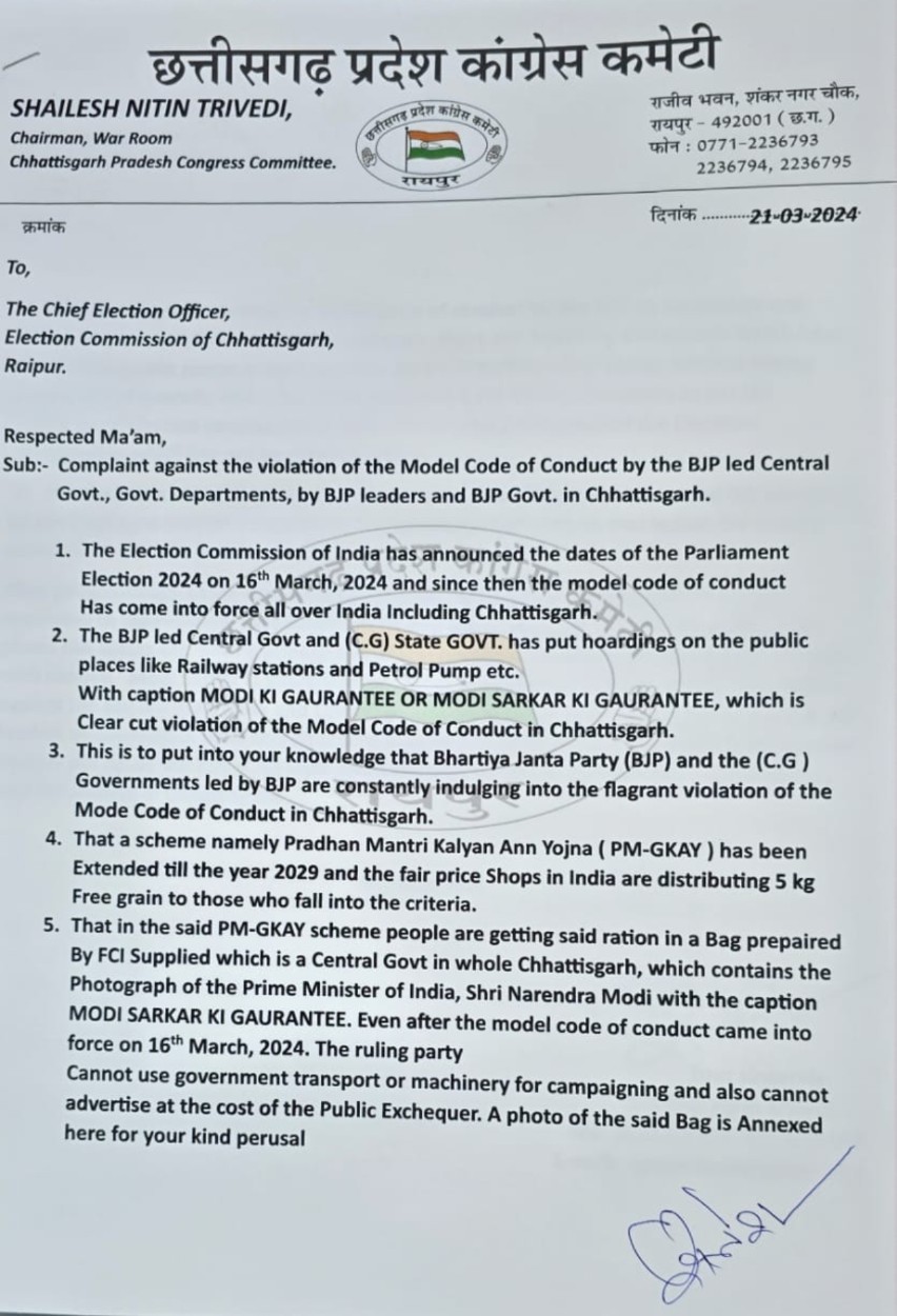 ज्ञापन में कहा गया कि वर्तमान समय में सम्पुर्ण भारत में आदर्श आचार संहिता लागू है ऐसे स्थिति में छत्तीसगढ़ राज्य के सभी जिलों के क्षेत्राधिकार से संबंधित राशन दुकानों में मोदी जी के फोटोयुक्त कैरीबैग, थैला में राशन सामग्री दिया जाना जो कि आदर्श आचार संहिता का घोर उल्लघंन है। इसके साथ ही पेट्रोल पंपो, एवं रेल्वे स्टेशनों में प्रधानमंत्री नरेन्द्र मोदी के फोटो वाले विज्ञापन लगे है। इसको तत्काल हटाया जाये यह आदर्श आचार संहिता का उल्लघंन इस मामले दोषी लोगो पर तत्काल कार्यवाही किया जाये। मोदी के फोटो वाले होर्डिंग हटाया जाये।