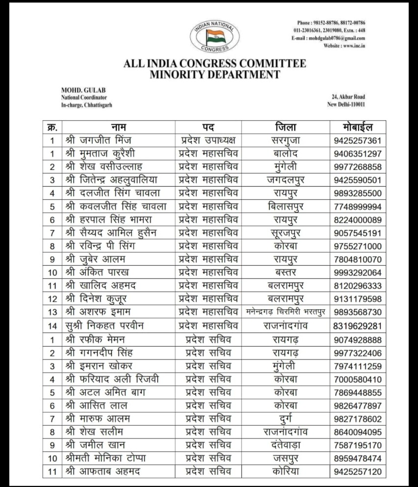 जगदलपुर।एआईसीसी के चेयरपर्सन द्वारा अल्पसंख्यक विभाग कांग्रेस में छत्तीसगढ़ के नियुक्तियों को विस्तार करते हुए प्रदेश पदाधिकारियों के साथ जिला अध्यक्षों की नियुक्ति की गई है । बस्तर जगदलपुर से लगातार सक्रिय श्री रोजविन दास को बस्तर जिला अध्यक्ष की जिम्मेदारी दी गई है।