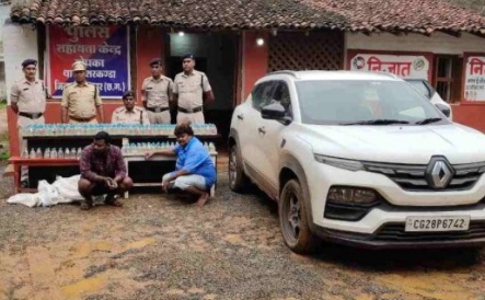 पुलिसकर्मी के कार से दो पेटी देसी शराब जब्त, दो आरोपी गिरफ्तार,आरक्षक फरार