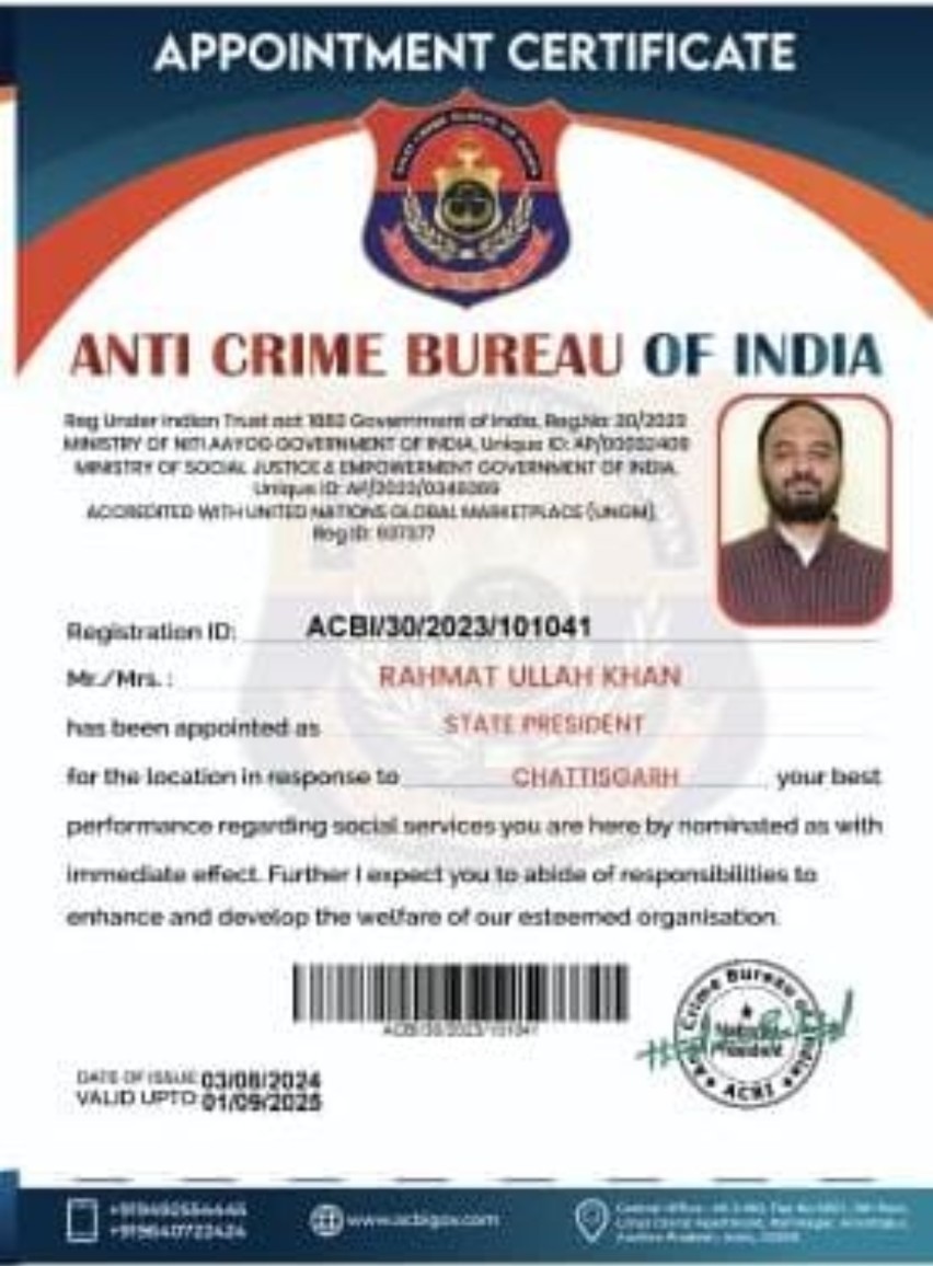 रहमत उल्ला खान बने एन्टी क्राइम ब्यूरो ऑफ इंडिया के प्रदेश अध्यक्ष