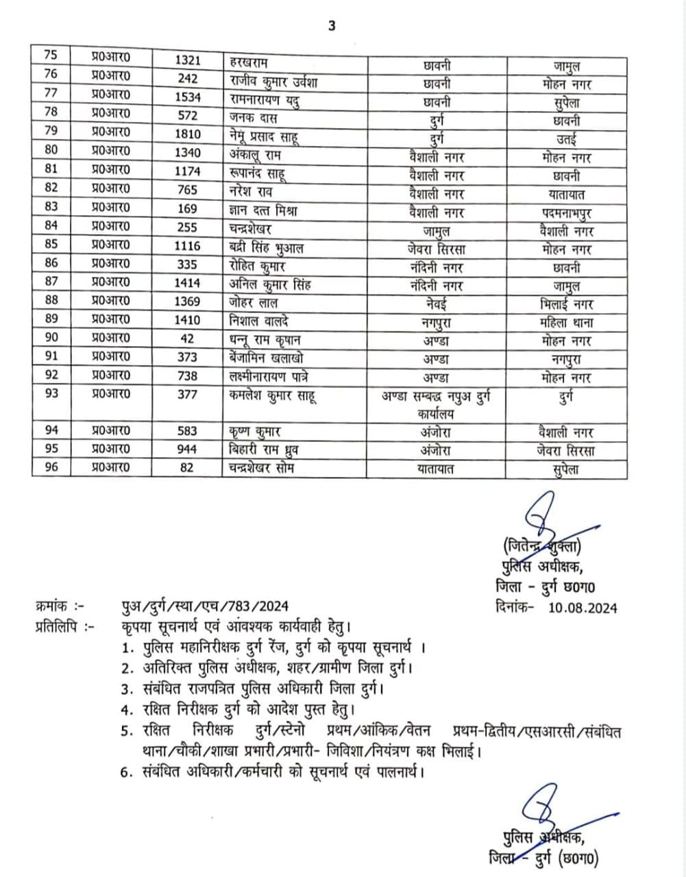 छत्तीसगढ़ में आगामी नगरीय निकाय चुनाव के पहले लगातार पुलिस विभाग में तबादलो का दौर जारी है। इसी बीच खबर आई है कि दुर्ग एसपी जितेन्द्र शुक्ला ने जिले में बड़ी प्रशासनिक सर्जरी करते हुए, लंबे समय से एक ही जगह पर तैनात 96 पुलिस कर्मियों का ट्रांसफर आर्डर जारी किया है। आदेश के अनुसार 23 सब इंस्पेक्टर, 3 एएसआई और 70 हवलदारों को इधर से उधर किया गया है। इनमें रक्षित केंद्र के 11 सब इंस्पेक्टरों का नाम भी शामिल है।