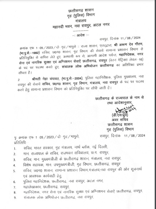 छत्तीसगढ़ में रविवार देर रात 2 आईपीएस अफसरों के ट्रांसफर किए गए हैं। इसमें 1992 बैच के आईपीएस अरुण देव गौतम और 2004 बैच की नेहा चंपावत के तबादले किए गए हैं। आईपीएस अरुण देव गौतम को नगर सेना, नागरिक सुरक्षा और अग्निशमन सेवा का महानिदेशक बनाया गया है।अभी तक वे सामान्य प्रशासन विभाग में प्रतिनियुक्ति पर थे।