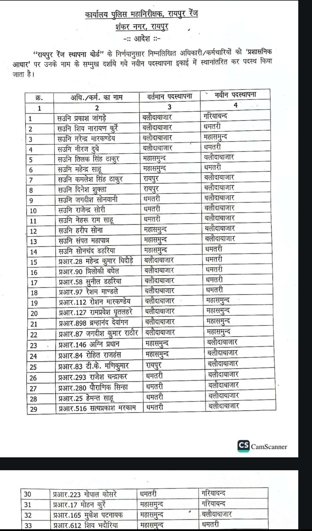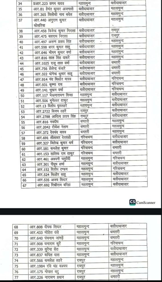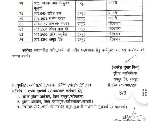 जारी आदेश के अनुसार, रायपुर रेंज के रायपुर, गरियाबंद, धमतरी, बलौदाबाजार, महासमुंद जिले के कुल 84 पुलिसकर्मियों का ट्रांसफर हुआ है. इनमें 14 ASI, 22 प्रधान आरक्षक और 48 पुलिसकर्मियों का नाम शामिल है.