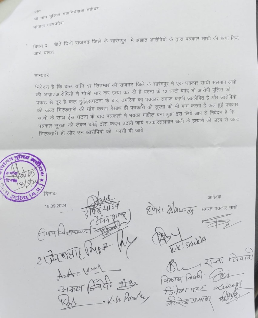 ज़िले के सारंगपुर स्थित सिविल हॉस्पिटल के सामने स्थित कॉम्पलेक्स की सीढ़ियों पर खड़े युवा पत्रकार सलमान अली की अज्ञात हमलावरों ने मारी गोली मार कर हत्या कर दी। पुलिस तफ्तीश में जुटी है और हमलावारों की तलाश में आसपास के सीसीटीवी के साथ सुराग खंगाले जा रहे हैं।पूरी घटना मध्य प्रदेश के राजगढ़ जिले के सारंगपुर की हैं जहा बाइक सवार तीन लोगों ने पत्रकार की गोली मारकर बीती रात हत्या कर दी पत्रकार 35 वर्षीय सलमान की हत्या रात 9 बजे की बताई जा रही है। बाइक सवार हत्यारों ने पत्रकार की हत्या उसके मासूम बेटे के सामने ही इस जघन्य वारदात को अंजाम दिया है।घटना से क्षुब्ध उमरिया जिले के पत्रकारों ने आज एसपी उमरिया निवेदिता नायडू को पुलिस महानिदेशक मध्यप्रदेश के नाम ज्ञापन सौंपते हुए आरोपियों की जल्द से जल्द गिरफ्तारी की मांग की है। साथ ही ऐसे वारदात को अंजाम देने वाले आरोपियों के खिलाफ कड़ी कार्यवाही की मांग की है।
