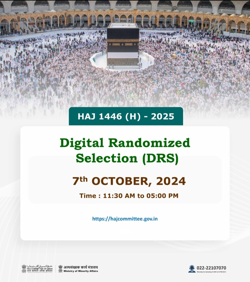 रायपुर। छत्तीसगढ़ राज्य हज कमेटी के चेयरमैन मोहम्मद असलम खान ने आज जारी प्रेस विज्ञप्ति में बताया की, हज कमेटी ऑफ़ इंडिया मुंबई से प्राप्त सूचना अनुसार हज 2025 के लिए आवेदन किये हज यात्रियों का डिजिटल रेंडम सिलेक्शन हज कमेटी ऑफ इंडिया द्वारा दिनांक 07/10/2024 को प्रातः 11:30 बजे से किया जावेगा। हज यात्रियों द्वारा उनके सिलेक्शन की जानकारी हज कमेटी ऑफ़ इंडिया की वेबसाइट www.hajcommittee.gov.in से प्राप्त की जा सकेगी। अधिक जानकारी के लिए कार्यालय छत्तीसगढ़ राज्य हज कमेटी के दूरभाष क्रमांक 0771-4266646 पर संपर्क किया जा सकता है।