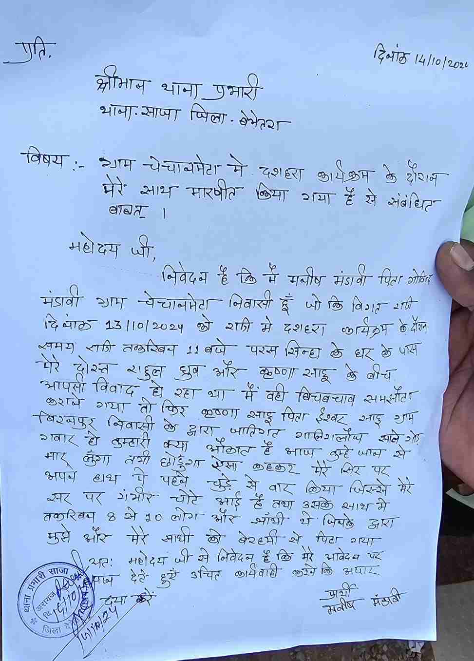 शिकायत पत्र में बताया गया है कि 13 अक्टूबर को ग्राम चेचानमेटा में दशहरा कार्यक्रम के दौरान रात 11 बजे मनीष का दोस्त राहुल और विधायक पुत्र कृष्णा साहू के बीच विवाद हो रहा था. जब मनीष ने बीच बचाव किया तो विधायक पुत्र ने जातिगत गाली-गलौज करते हुए हाथ के कड़े से मारा. मारपीट में विधायक पुत्र के साथ करीब दस लोग और थे, जिन्होंने मनीष और उसके दोस्त राहुल से मारपीट की है.