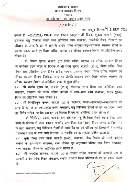 छत्तीसगढ़ में IAS अफसरों का एक बार फिर तबदला हुआ है।सामान्य प्रशासन विभाग द्वारा जारी निर्देश के मुताबिक डॉ प्रियंका शुक्ला को विशेष सचिव स्वास्थ्य