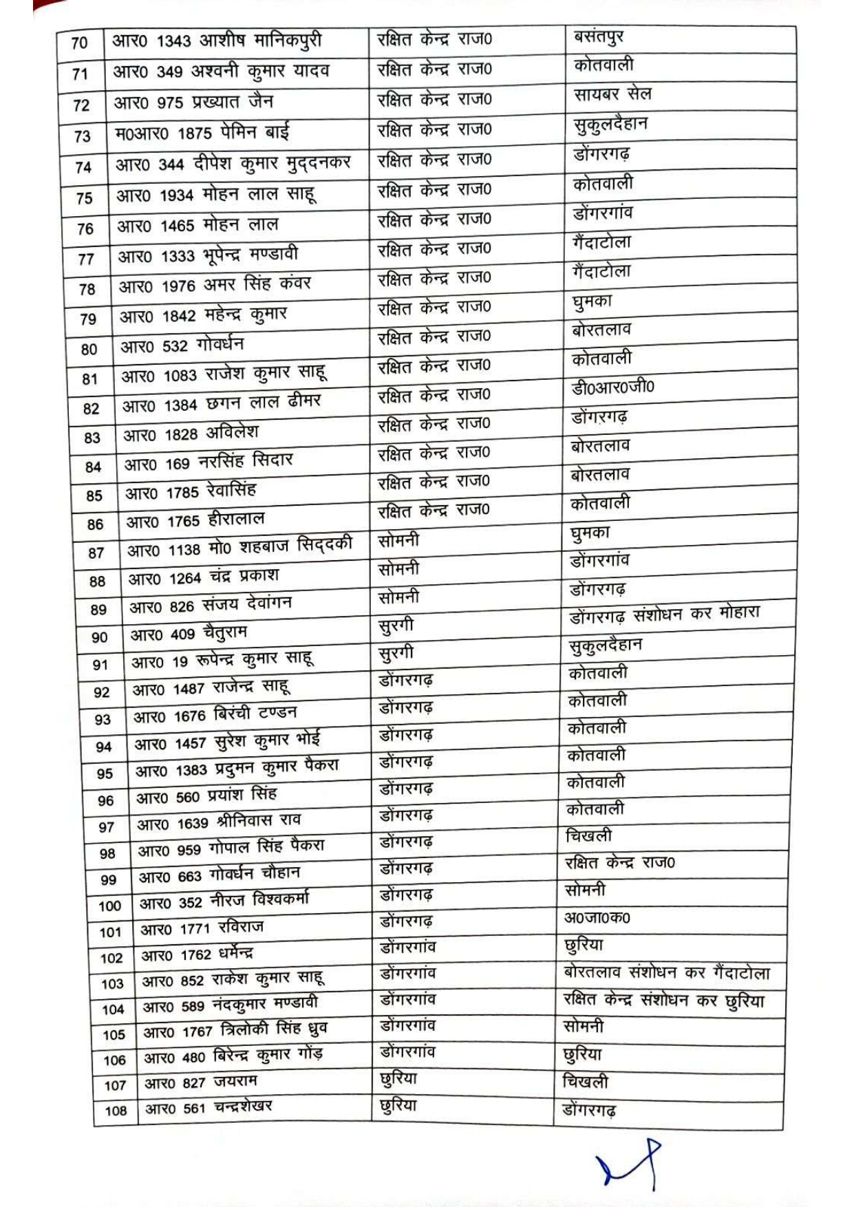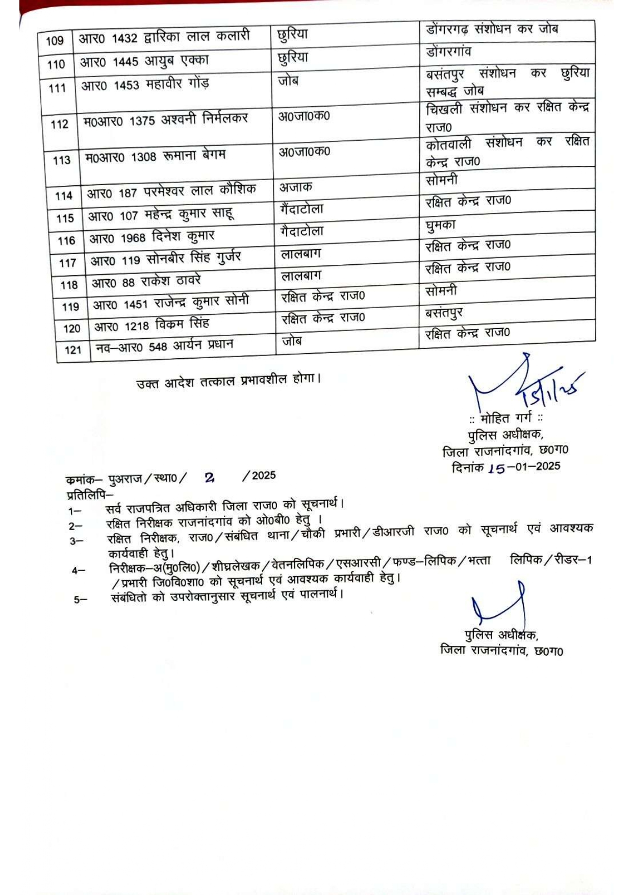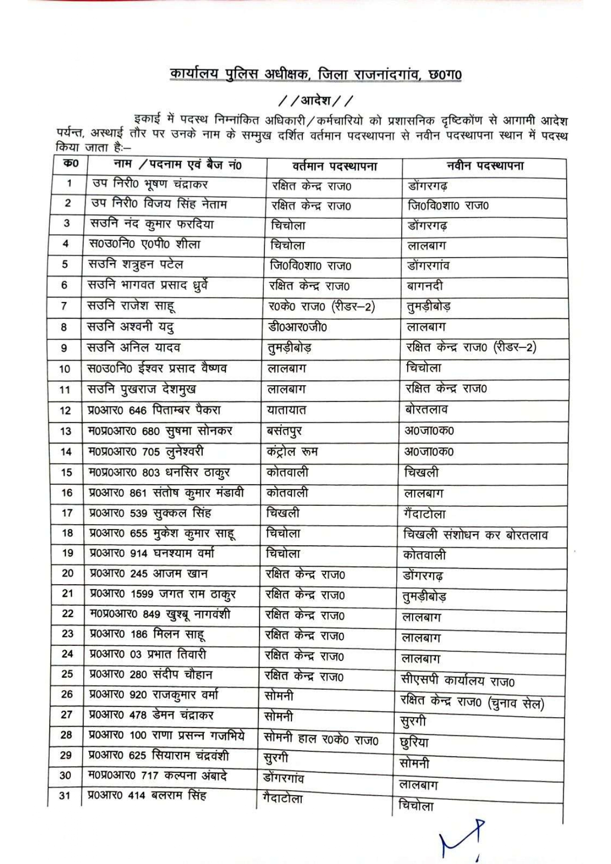 राजनांदगांव। जिला पुलिस विभाग में बड़ा फेरबदल हुआ है। पुलिस अधीक्षक कार्यालय ने बुधवार को जिले में पदस्थ 121 पुलिस अधिकारियों और कर्मचारियों के तबादले का आदेश जारी किया है। इनमें आरक्षक, पुरुष और महिला प्रधान आरक्षक, उप निरीक्षक और सहायक उप निरीक्षकों का नाम शामिल है।