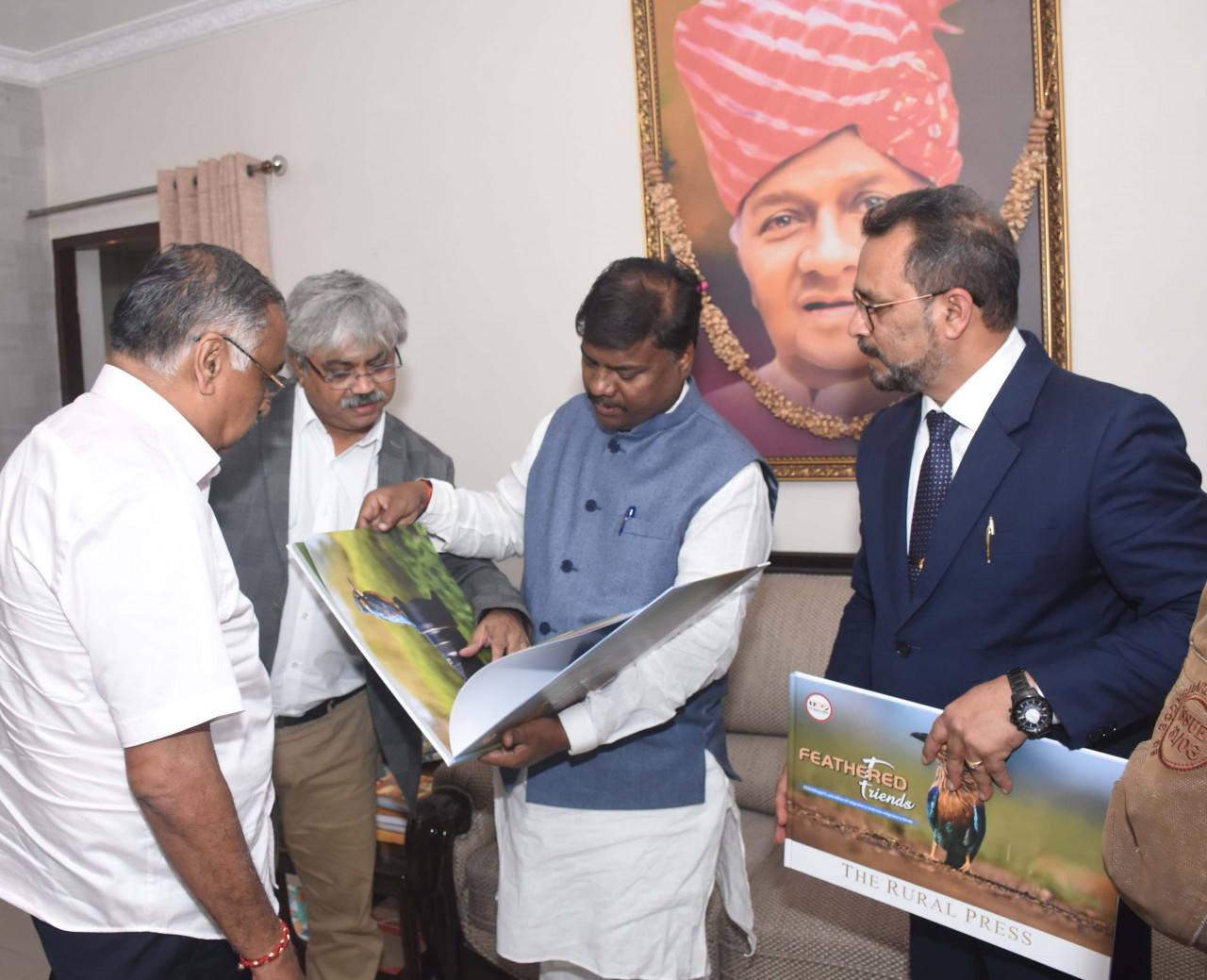 वन एवं जलवायु परिवर्तन मंत्री श्री केदार कश्यप ने छत्तीसगढ़ की जैव विविधता पर आधारित फैदर फ्रेंड्स कॉफी टेबल बुक का आज अपने निवास कार्यालय में विमोचन किया। यह कॉफी टेबल बुक छत्तीसगढ़ राज्य की जैव विविधता और पक्षियों की प्रजातियों पर केंद्रित है। जिसका प्रकाशन टीआरपी न्यूज रायपुर द्वारा किया गया।