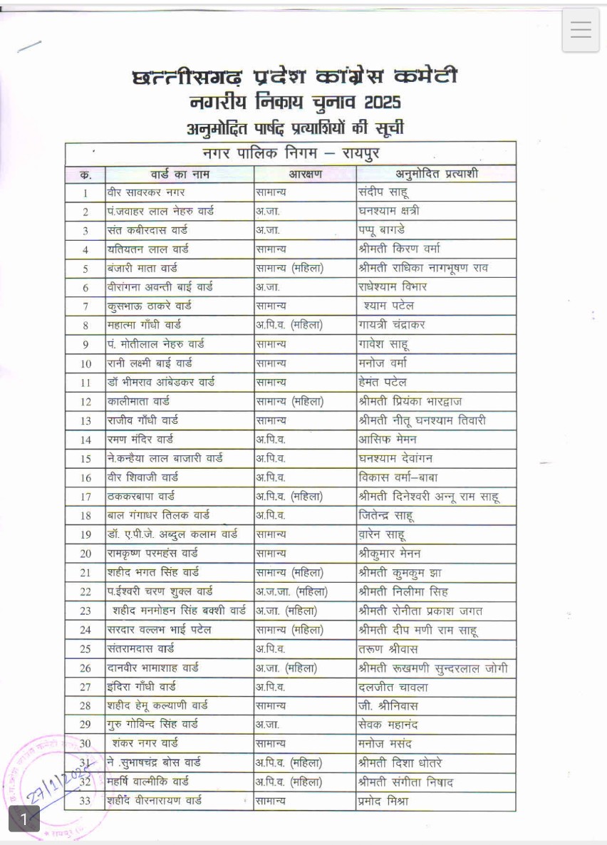 रायपुर नगर निगम चुनाव, कांग्रेस ने 66 वार्डों के लिए लिस्ट की जारी…