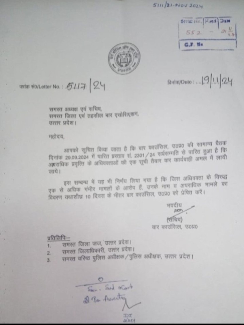 19 दिसंबर 2024 को बार काउंसिल द्वारा समस्त जिम्मेदार अधिकारियों को आदेश जारी किए थे अपने-अपने क्षेत्र के दागी अधिवक्ता की सूची चिन्हित कर बार काउंसिल को भेजें