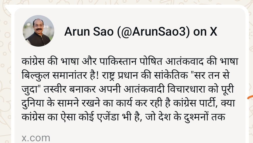 रायपुर। कांग्रेस द्वारा प्रधानमंत्री नरेंद्र मोदी जी की विवादित पोस्टर सोशल मीडिया में पोस्ट करने पर छत्तीसगढ़ से पहली प्रतिक्रिया आई है। उप मुख्यमंत्री अरुण साव ने पीएम के विवादित पोस्ट करने पर कांग्रेस को लताड़ लगाई है। उन्होंने कांग्रेस नेता राहुल गांधी से पूछा कि, क्या कांग्रेस अब नेहरू की जगह मसूद अजहर के विचारों से चलेगी। देश अपने राष्ट्र प्रधान का अपमान बर्दाश्त नहीं करेगा।