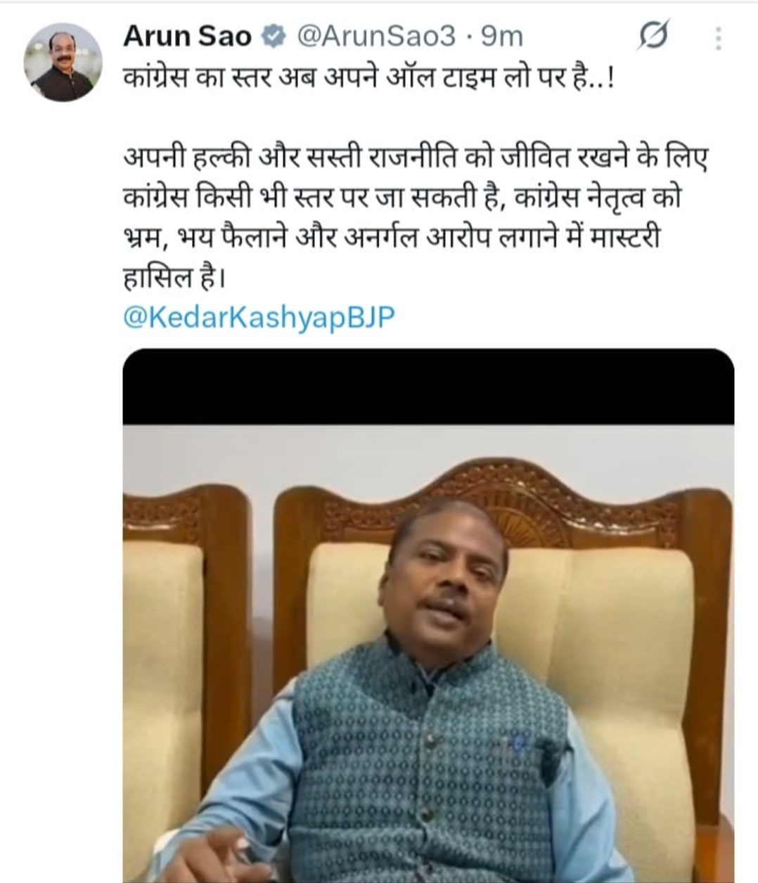 डिप्टी सीएम साव ने मंत्री केदार कश्यप का वीडियो पोस्ट करते हुए कांग्रेस को भय, भ्रम और अनर्गल आरोपों पर जीवित संगठन बताया।