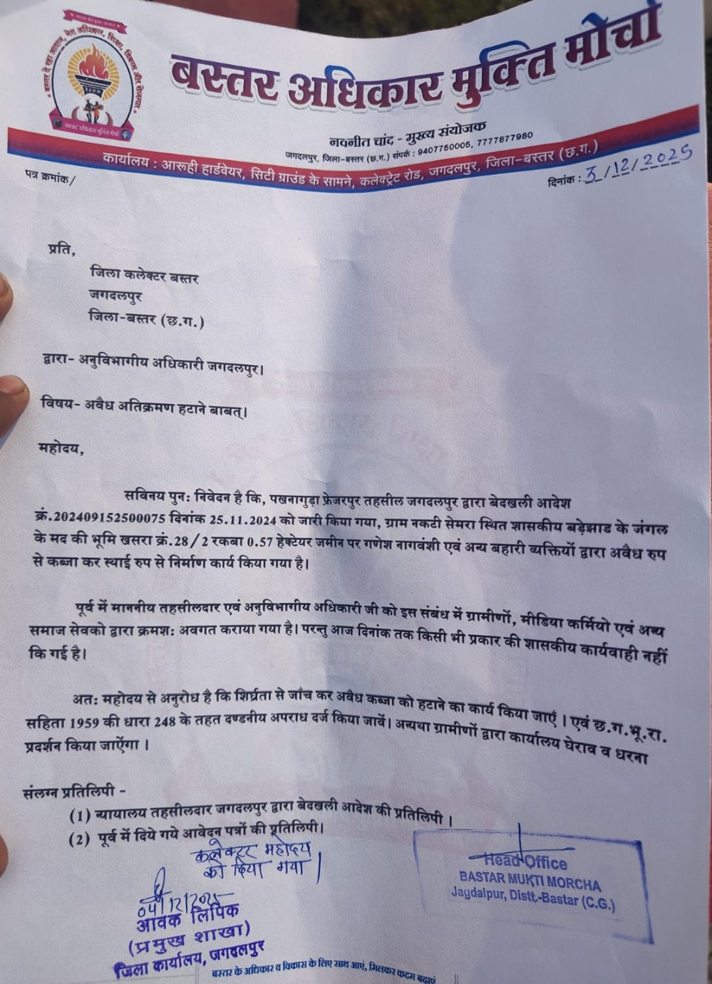 जगदलपुर।बस्तर अधिकार मुक्ति मोर्चा के प्रमुख संयोजक एवं जनता कांग्रेस के संभागीय अध्यक्ष के नेतृत्व में आज ग्रामीणों के साथ पदाधिकारी एवं कार्यकर्ताओं का समूह कलेक्ट्रेट पहुंचा जहां उन्होंने कलेक्टर से मुलाकात उन्हें पखनागुड़ा स्थित फ्रेजरपुर पर तहसील जगदलपुर द्वारा जारी बेदखली आदेश के संदर्भ में नकटी सेमरा स्थित बड़ेझाड़ के जंगल के मद की भूमि जो 0.57 हेक्टेयर है को गणेश नागवंशी एवं बाहरी व्यक्ति द्वारा कब्जा किए जाने के विषय में अवगत कराया एवं इस विषय में ज्ञापन भी सोपा गया।