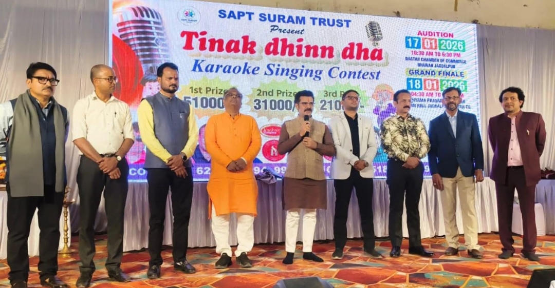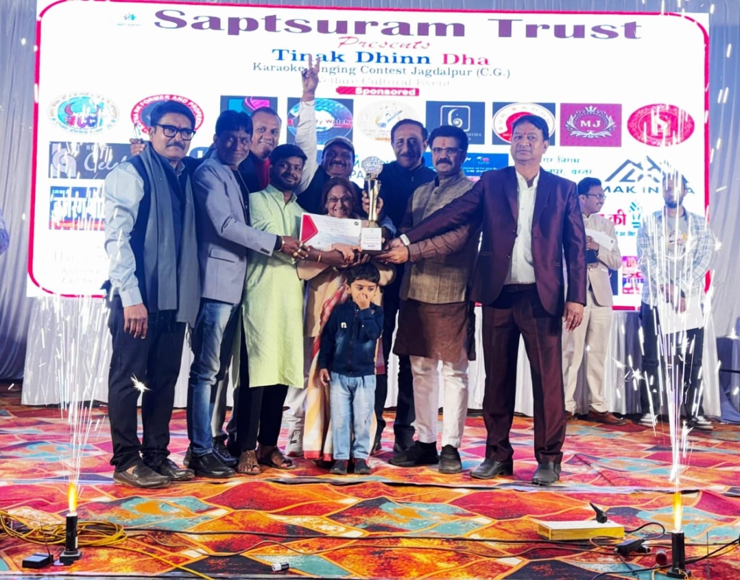 जगदलपुर ,नवीन श्रीवास्तव।— सप्त सुरम ट्रस्ट द्वारा आयोजित “तिनक धिन धा कराओके सिंगिंग कॉन्टेस्ट” का ग्रैंड फिनाले रविवार को श्यामा प्रसाद मुखर्जी टाउन हॉल, जगदलपुर में भव्य रूप से संपन्न हुआ। प्रतियोगिता के ऑडिशन बस्तर चेंबर ऑफ कॉमर्स में आयोजित किए गए थे, जिसमें कुल 120 प्रतिभागियों ने भाग लिया। इनमें से 25 प्रतिभागियों का चयन ग्रैंड फिनाले के लिए किया गया।